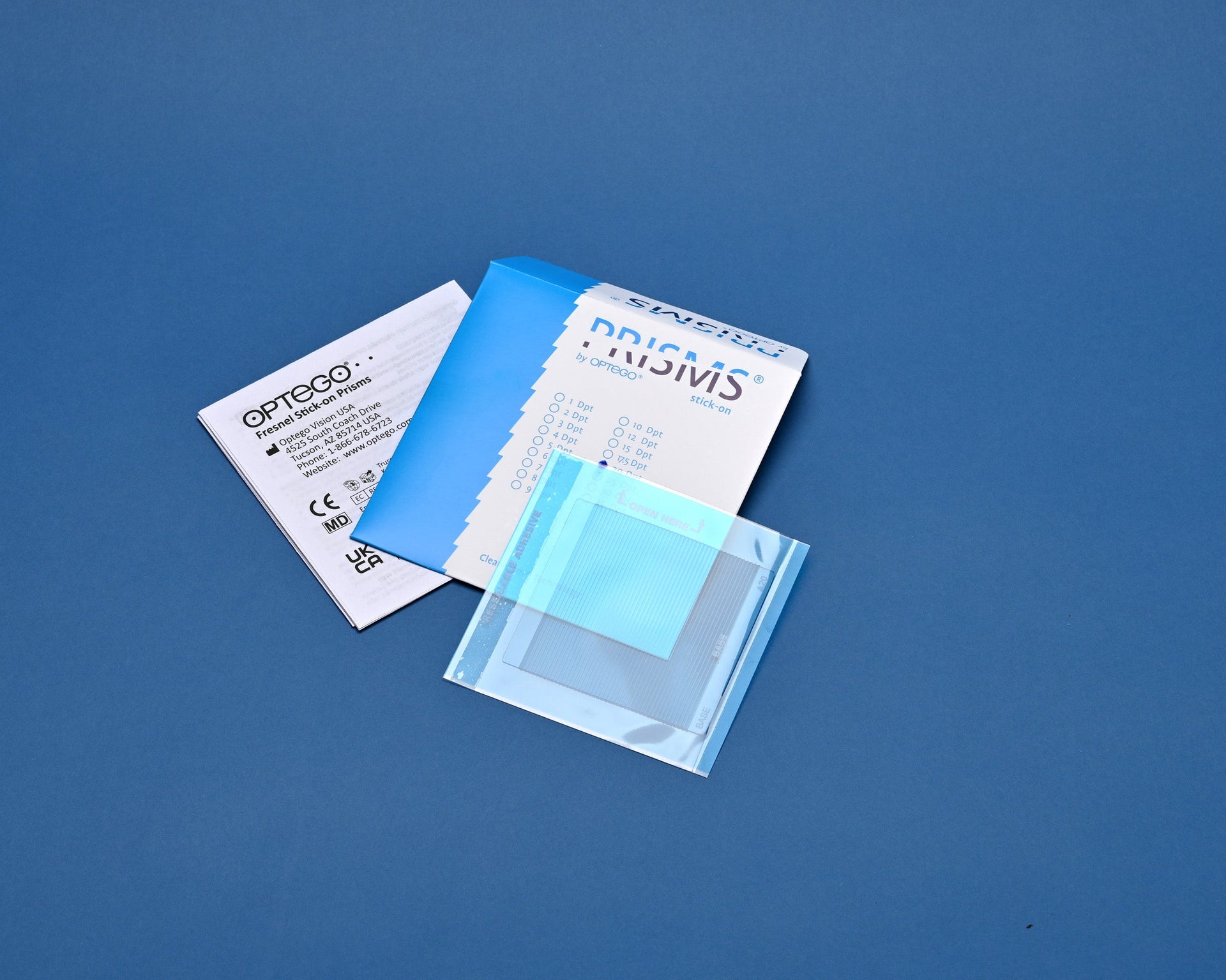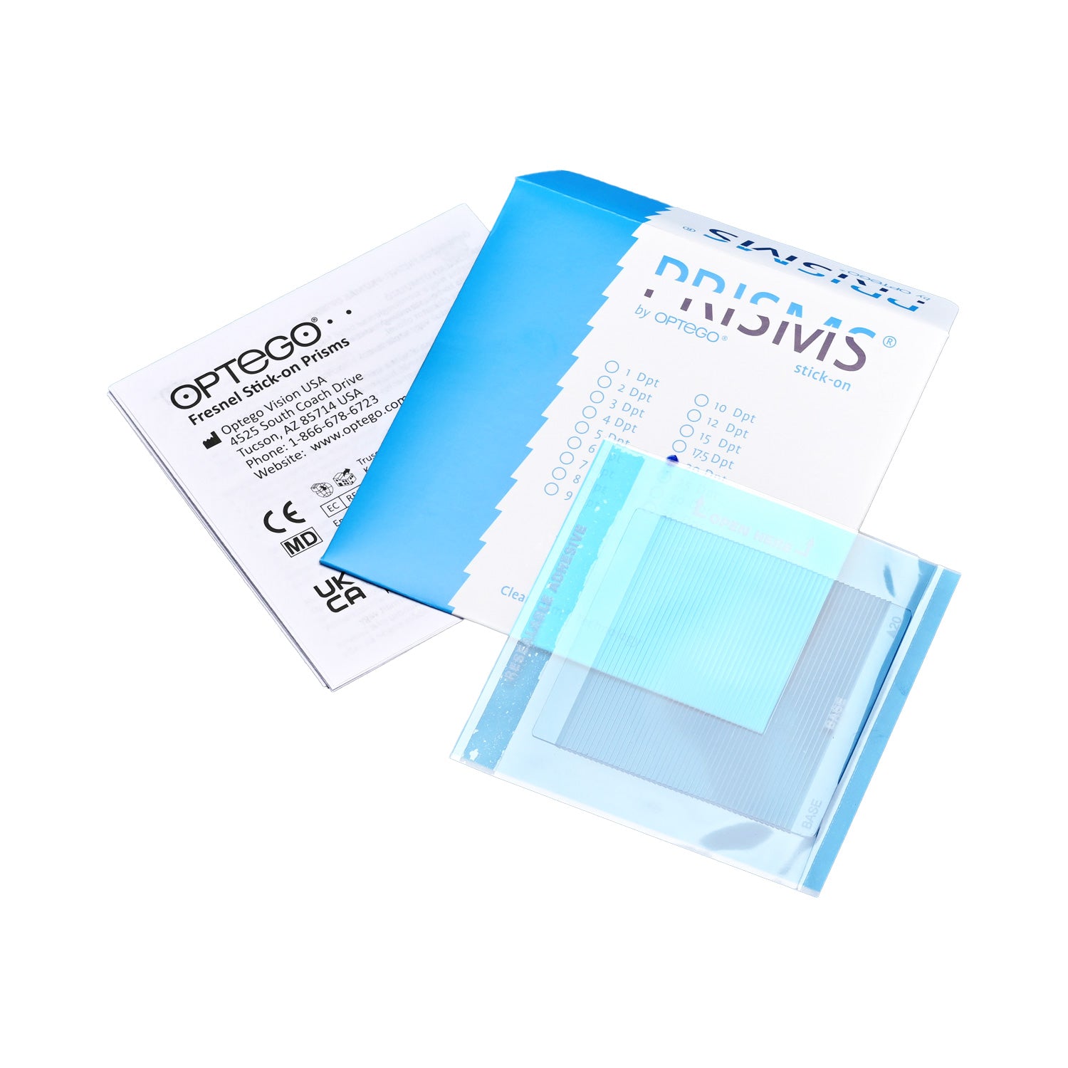 Optego® Stick-on Prisms are Fresnel-type prisms which provide temporary visual correction and are simple to affix to eyeglasses. Our proprietary ClearPrism® Technology protocol ensures that our prisms offer high-grade optical clarity. All prisms are made in the USA. For printable instructions for use, please click here.