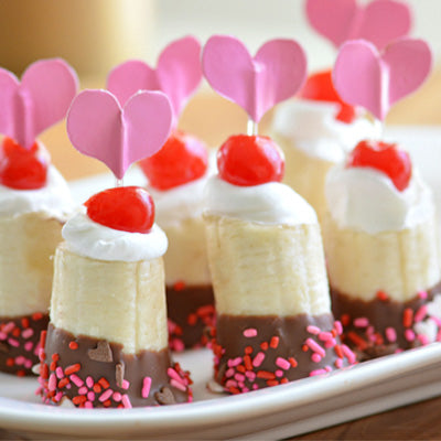 Chocolate dipped bananas topped with cupcake toppers turn these into a fun Valentine’s Day treat!