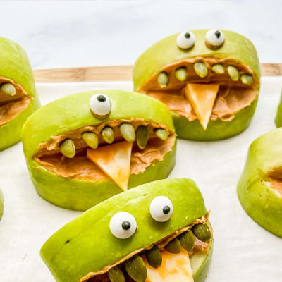 These adorable apple monster faces are super simple to make and perfect for the whole family – especially if you like peanut butter and apples!